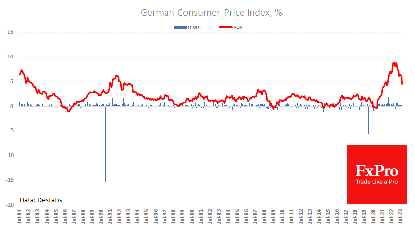 根据Dtati的初步估计,德国9月份消费者通胀放缓幅度大于预期。 价格同比增长率从6.1%放缓至4.5%,而预期为4.6%。然而,月度增长率仍然很高,过去四个月每个月增长0.3%,使年增长率达到3.6%。 另外,周四西班牙的通货膨胀率从上个月的2.6%和6月份1.9%的低点加速至3.5%。 总体而言,弱于预期的通胀和经济活动数据的