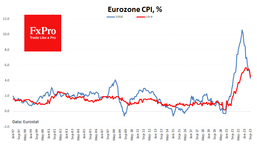 最近来自欧洲和美国的报告突显出通胀放缓。价格增长放缓引发了一波购买风险资产的浪潮,投资者希望央行不会将利率维持在限制性水平太久。 Fxro高级分析师AlxKutikvich指出:在欧元区,9月份整体通胀率同比从5.2%降至4.3%,核心个人消费支出从5.3%降至4.5%。这两方面的数据都低于预期。这立即激发了人们对欧洲央行不再需