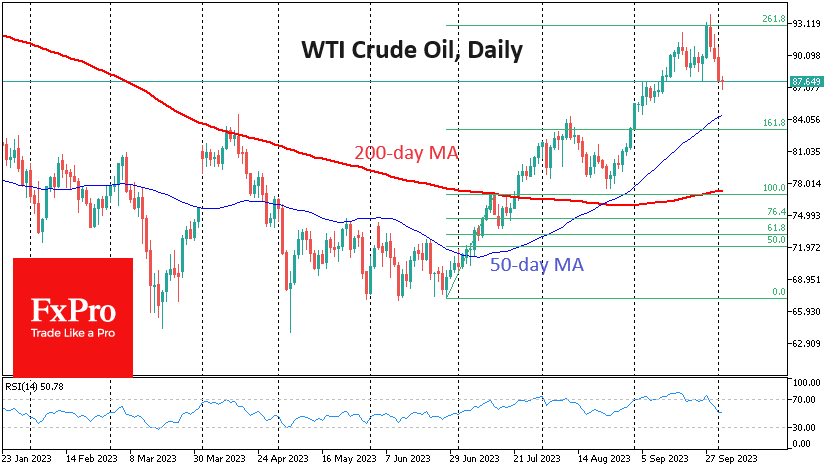 油价在触及13个月高点后连续第四个交易日下跌。西德克萨斯中质原油(WTI)的现货价格接近每桶94美元,这似乎是看涨者为维护自己的优势所做的最后一搏。 Fxro高级分析师AlxKutikvich指出:然而,这似乎是自6月份价格暴跌以来的第三波上涨。自上周四以来,盘中反弹受到大量卖单的抑制。西德克萨斯中质原油周二一度跌破87