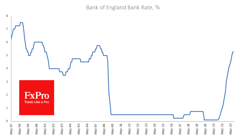 英格兰银行将其关键利率维持在5.25%不变。昨日英国发布通胀报告后,英镑报价积极反映了这种结果的可能性。 同期的汇评指出,英国央行(Bankofngland)的GD增长前景不断恶化,劳动力市场出现恶化迹象。此外,央行预计通胀将在近期显著放缓。 Fxro高级分析师AlxKutikvich指出:鉴于能源价格回升、生产者价格回升以及消