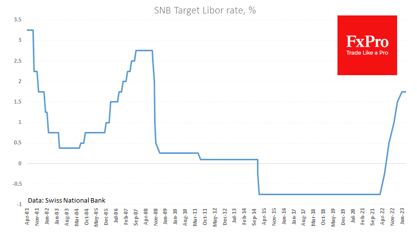 瑞士央行将关键利率维持在1.75%。平均来看,市场一直预测加息25个基点,与我们的预期相反。 Fxro高级分析师AlxKutikvich指出:最有可能的原因是,市场参与者的预测受到了一周前欧洲央行加息的影响。此外,预期中的瑞典和挪威的政策收紧确实真正发生了。但有一些事情使瑞士有别于其他欧洲国家。 首先是通货膨胀。过