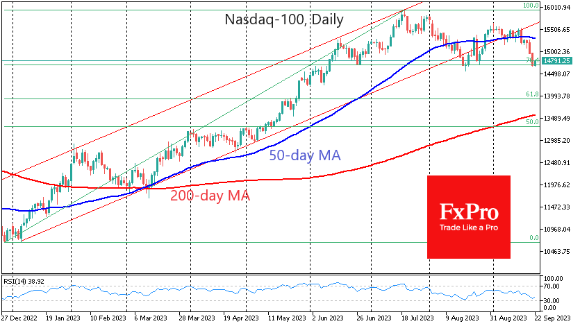 在经历了周三和周四的暴跌之后,美国股市尝试在周五反弹。纳斯达克100指数接近关键水平,逆转了6月和8月的涨幅。标准普尔500指数已经跌破类似的支撑位,这种情况令人担忧。 周五早盘,纳斯达克100指数期货跌破14700点。此前,在6月26日和8月18日,该区域支撑向上的逆转。但在此期间,情况已经恶化。今年6月,在上涨