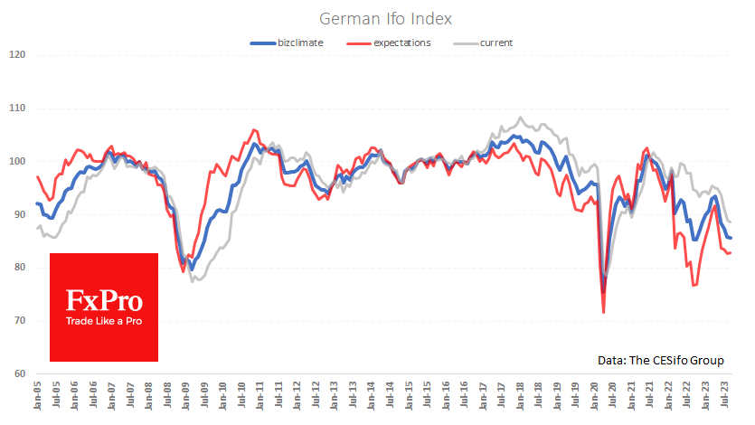德国9月份Ifo商业景气指数(Ifobuincliatindx)与上月持平,尽管市场预期该指数将进一步恶化。 Fxro高级分析师AlxKutikvich指出:商业环境指数从85.8降至85.7,好于预期的85.1,但仍是2020年年中以来的最低水平。排除这一峰值,现代历史上唯一一次市场情绪恶化是在2008年11月至2009年7月的9个月期间。 当前状况指数从