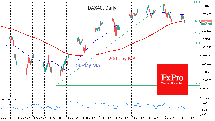 越来越多的证据表明,股市正从近12个月前开始的上涨行情中深度回调。欧洲主要股指最近几天的反应很能说明问题。 Fxro高级分析师AlxKutikvich指出:德国DAX40指数在上周末跌破200日移动均线,周一跌破该水平,与15500点的关键支撑线重合。 在7月的最后几天,当DAX40指数触及16500点上方的多年高点时,看跌者最终屈服