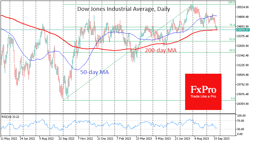 道琼斯指数正以200日移动均线的形式测试长期趋势的强度。这条曲线在5月底触底,并在3月短暂跌破,其特征是买盘增加。市场上还有足够多的买家再次买断暴跌吗?很多人对此表示怀疑。 自本周初以来,美国道琼斯指数一直在34000点以下交易,回到了7月初的低点,当时我们看到了最后一次牛市试图让市场升温。自8月以来,主动权