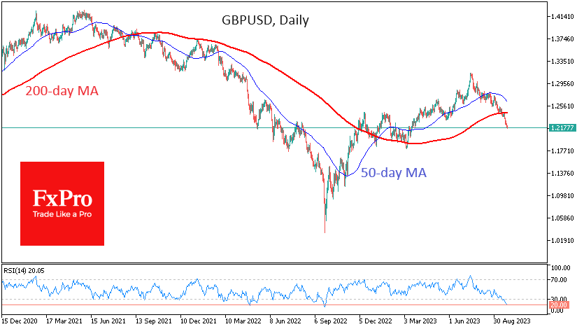 英镑兑美元连续第五个交易日下跌,跌破1.2200。自本月初英镑压力加剧以来,英镑兑美元下跌了4%,较7月份的峰值下跌了7.3%。 Fxro高级分析师AlxKutikvich指出:从根本上说,英镑最新阶段的抛售是由于英国央行对最新通胀报告的反应弱于预期。技术面原因是跌破200日移动均线,这促使一些关键市场人士修正其长期展望。