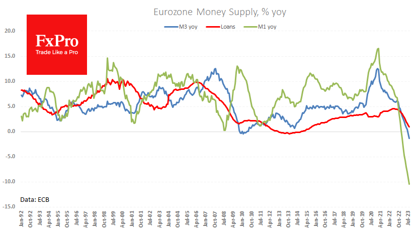 欧洲央行去年9月开始加息,这立即在货币供应和贷款的动态上体现出来。这个过程一直持续到今天。 欧元区的年同比信贷增长已经放缓至1.0%,这是8年来的最低水平。然而,通过货币总量1和3,人们预计年度收缩。 8月3货币总量年同比收缩1.3%,刷新了2010年的历史低点,当时最大年同比收缩为0.4%。 狭义货币总量1自年初以