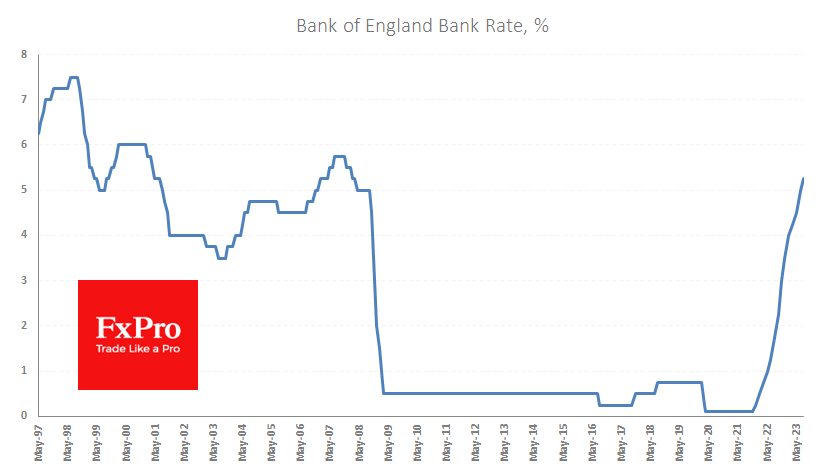 正如市场普遍预期的那样,英国央行将其关键利率提高了25个百分点至5.25%。9名委员中有8人投票赞成加息,其中2人支持加息50个基点。 Fxro高级分析师AlxKutikvich指出:英格兰银行最新的预测显示,与5月份通货膨胀报告中的“略高于4%”相比,利率最高将超过6%。这是市场和央行对粘性通胀的反应。 尽管如此,劳动力市