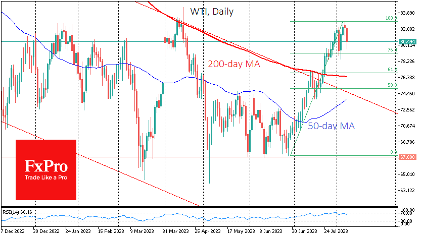 自周二开盘以来,原油价格下跌了约2.5%,至每桶80.1美元,原因是风险资产失去了吸引力,同时又出现了对中国经济增速的新一轮担忧。 Fxro高级分析师AlxKutikvich指出:世界第二大经济体的对外贸易数据显示,7月份出口同比下降14.5%,进口同比下降12.4%。在这两种情况下,新数据都低于预期和之前的数据。这导致7月份贸易