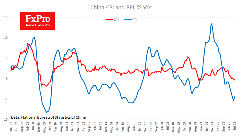 中国7月份CI(消费者物价指数)同比下降0.3%,媒体匆忙将其称为通货紧缩,而根据定义,这是价格持续下跌。更准确的方法是讨论一次性因素(包括去年的高基数)造成的反通胀压力。例如,猪肉价格下跌26%就导致了目前的下跌。 Fxro高级分析师AlxKutikvich指出:上月生产者价格同比下降4.4%,低于上年同期的5.4%。上升趋势很