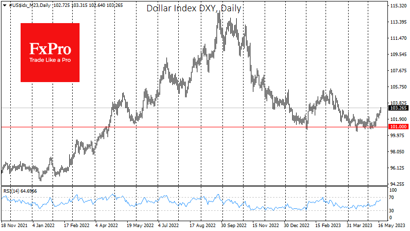 过去两周,美元兑主要竞争对手走强,兑一篮子主要货币上涨2%。美元指数超过103,这是自3月下半月以来的最高水平。 Fxro高级分析师AlxKutikvich指出: 值得注意的是,在美元走强的同时,股指也出现了反弹,这是一对奇怪的组合。美元正在上涨,下个月中旬有可能再次加息的可能性比较大。市场目前预计,美联储再次加息的