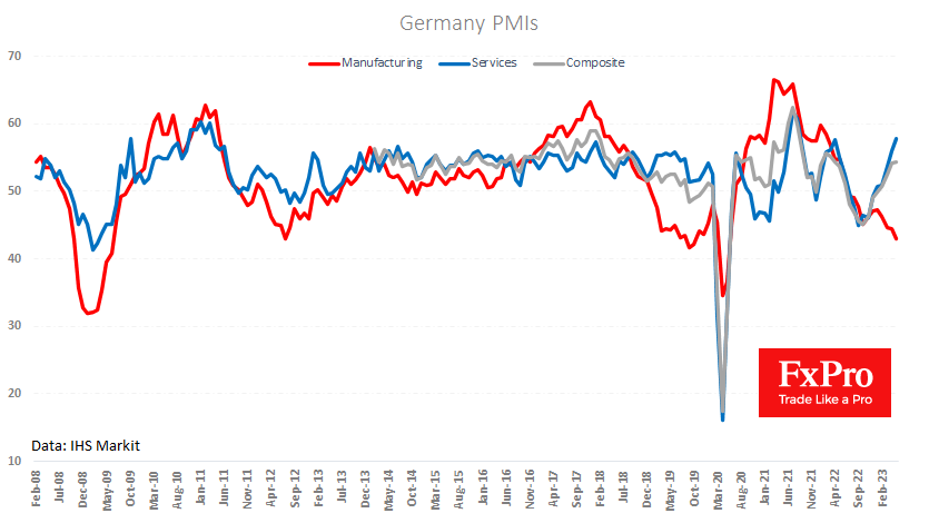 欧元区商业活动采购经理人指数的初步读数普遍显示出比预期更糟糕。根据综合指数,欧元区工业上一次遭受如此严重的损失是在2008至2009年,当时经济处于急剧下滑状态。 Fxro高级分析师AlxKutikvich指出: 自今年年初以来制造业活动的持续下降已经影响了服务业,在4月份达到年度高点之后,服务业可能已经出现从增长转向收
