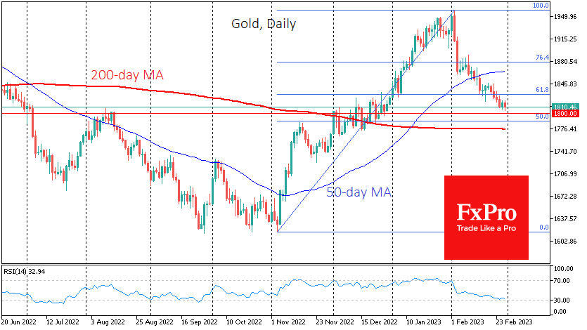 黄金继续测试底部,今天回落至1810美元以下。自2月初以来,走势显示上涨趋势出现了近乎完美的逆转,2日和3日的首次大幅回调之后是下跌趋势,几乎每天都在更新盘中低点。 Fxro高级分析师Alx?Kutikvich指出:直到上周中期,黄金的下跌符合典型的技术修正,但它现在的交易低于11月初1617美元到2日1960美元的高点的61.8%的