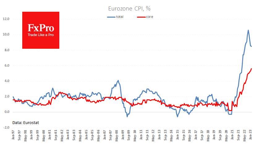 尽管过去一年,大宗商品和能源价格已从高点回落,供应链也有所恢复,但通胀仍是一个问题。这一论点今天在欧元区得到了证实。欧统局估计,欧元区的总体价格年增长率为8.5%/年。这比一个月前的8.6%和10月份的10.6%的峰值有所下降,但经济学家平均预计将放缓至8.3%。 Fxro高级分析师Alx?Kutikvich指出:更应该关注核心C