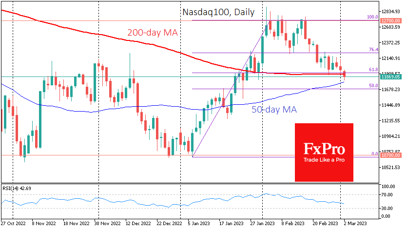 在对美联储货币政策前景进行持续重新评估的情况下,美国主要指数面临压力。标准普尔500指数和纳斯达克100指数再次测试关键技术支撑,回到一个多月前的十字路口。 Fxro高级分析师Alx?Kutikvich指出:纳斯达克100指数期货今日早间跌至11850点,为一个多月以来的低点,空头从1月初低点到一个月前高点的涨幅缩水了一半。更