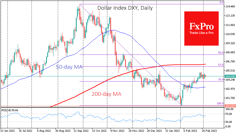 标准普尔500指数和纳斯达克100指数昨日盘中强劲反弹,吞噬了最初的跌幅,收盘走高。随着股市的反弹,美元指数正在形成向下行方向的逆转。 Fxro高级分析师AlxKutikvich指出:技术上,美元2月份的反弹已经清除了自去年9月下旬以来下跌过程中积累的超卖条件。日线上的RI触及超买区域,并在一周前被压低,为进一步下跌留下