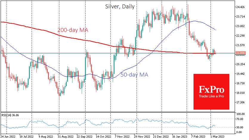 在过去的六个交易日中,每盎司白银的双向交易一直在21美元上方。2月份的大部分时间里,价格一直在下跌,从高点(24.62美元)跌至低点(20.41美元),跌幅超过17%。 Fxro高级分析师AlxKutikvich指出:上个月的抛售使价格回到200日移动平均线,并创造了中期超卖条件,短期内有望为正值,创造了重返24.0美元的机会。 上月