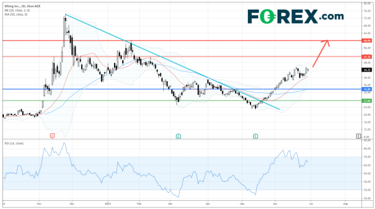 在日线图上,股价由5月低位反弹并升穿了由历史高位拉出的下降趋势线。目前,股价在上行的20日和50日均线之上交投。相对强弱指数亦在60多点。技术配置表示目前上行走势持续并以51.30美元和60.00美元作上行目标。