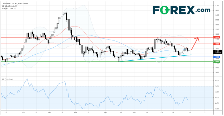 只要主要支持(止损)位16,900点不破,料中国A50 指数CFD可反弹至18,000点和18,550点作上行目标。