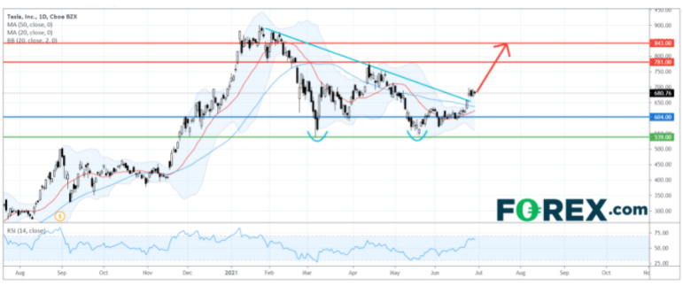 从技术角度看,如日线图所示,特斯拉股价的反弹动能正在增强。此前,它形成了双底型态,并升破1月以来的下降趋势线。