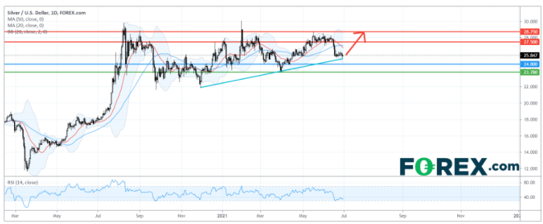 现货银价自去年8月升至超过7年新高后,走势一直横移盘整。美联储6月FOMC会议發佈的经济展望显示,官员的中位预测反映当局可能最快在2023年上调利率,较3月会议的预测有所提早。银价在该次会议后累计下跌了约7%。