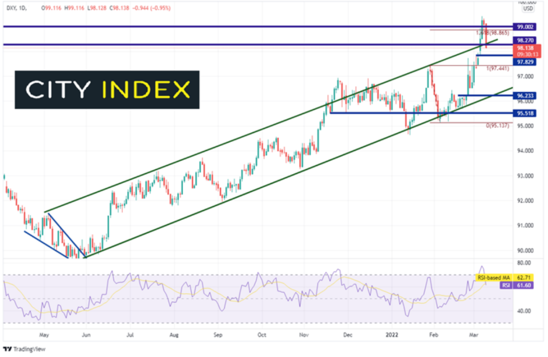 俄罗斯与乌克兰之间的战争出现结束的一线希望,美元因此将自创下2020年5月最高点以来的近期涨幅回吐一部分。美元指数周一测试了2021年5月以来的上斜通道的上轨趋势线、水平阻力位与1月28日高点到2月4日低点行情的161.8%扩展位后触及盘中高点99.42,RSI同样处于超买区域。美元指数今天迄今下跌近1%,回到长期通道内部。