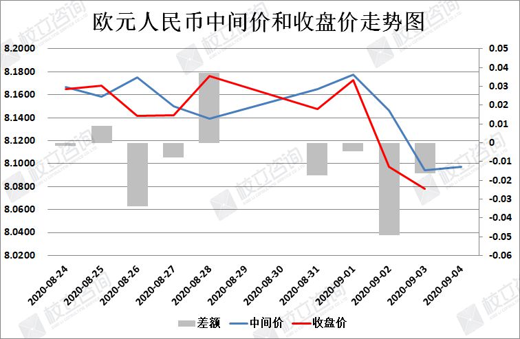 2020/9/4:欧元/人民币中间价报8.0974,中间价上调33点。中间价今天略微上调,中间价经过前期的大幅调整后今天再次收窄。上个交易日收盘价低于中间价,日内波幅较大。