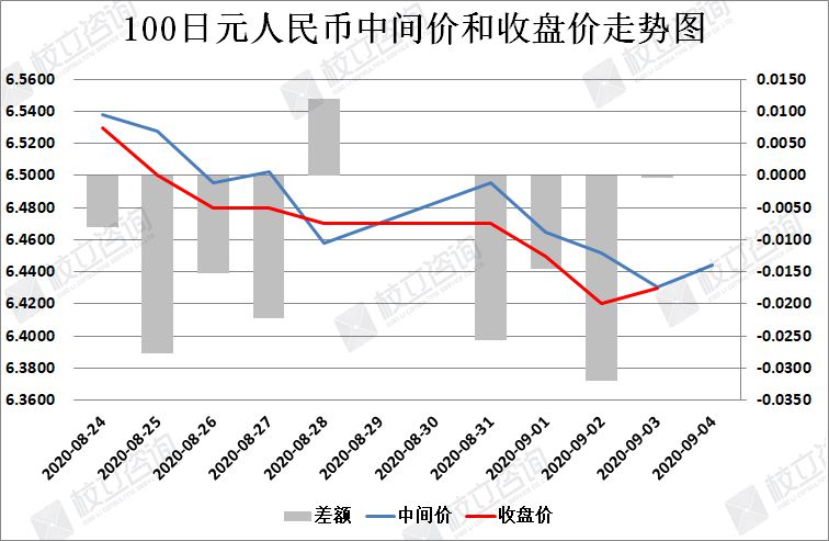 2020/9/4:100日元/人民币中间价报6.4441,中间价上调137点。中间价今日小幅上调,中间价经过三个交易日的下调后今天首次上调。上个交易日收盘价低于中间价,日内波幅较大。