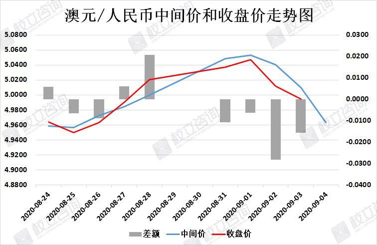 2020/9/4:澳元/人民币中间价报4.9632,中间下调点。中间价今日大幅下调,中间价连续大幅下调。上个交易日收盘价低于中间价,日内波幅较大。
