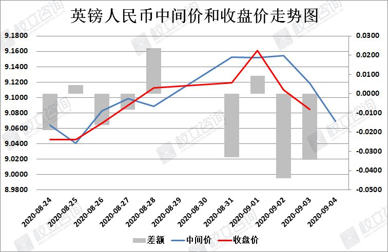 2020/9/4:英镑/人民币中间价报9.0694,中间价下调492点。中间价今日大幅下调,今天中间价调整幅度再次扩大。上个交易日收盘价大幅低于中间价,日内波幅较大。