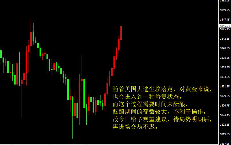 随着美国大选尘埃落定,对黄金来说,也会进入到一种修复状态,而这个过程需要时间来酝酿,酝酿期间的变数较大,不利于操作,故今日给予观望建议,待局势明朗后,再进场交易不迟。