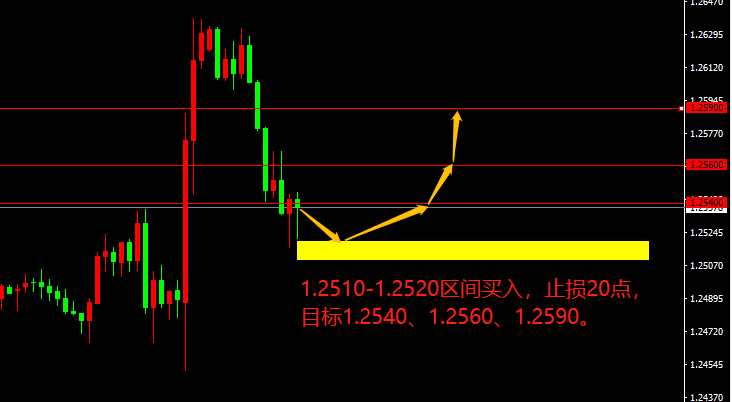 1.2510-1.2520区间买入,止损20点,目标1.2540、1.2560、1.2590。