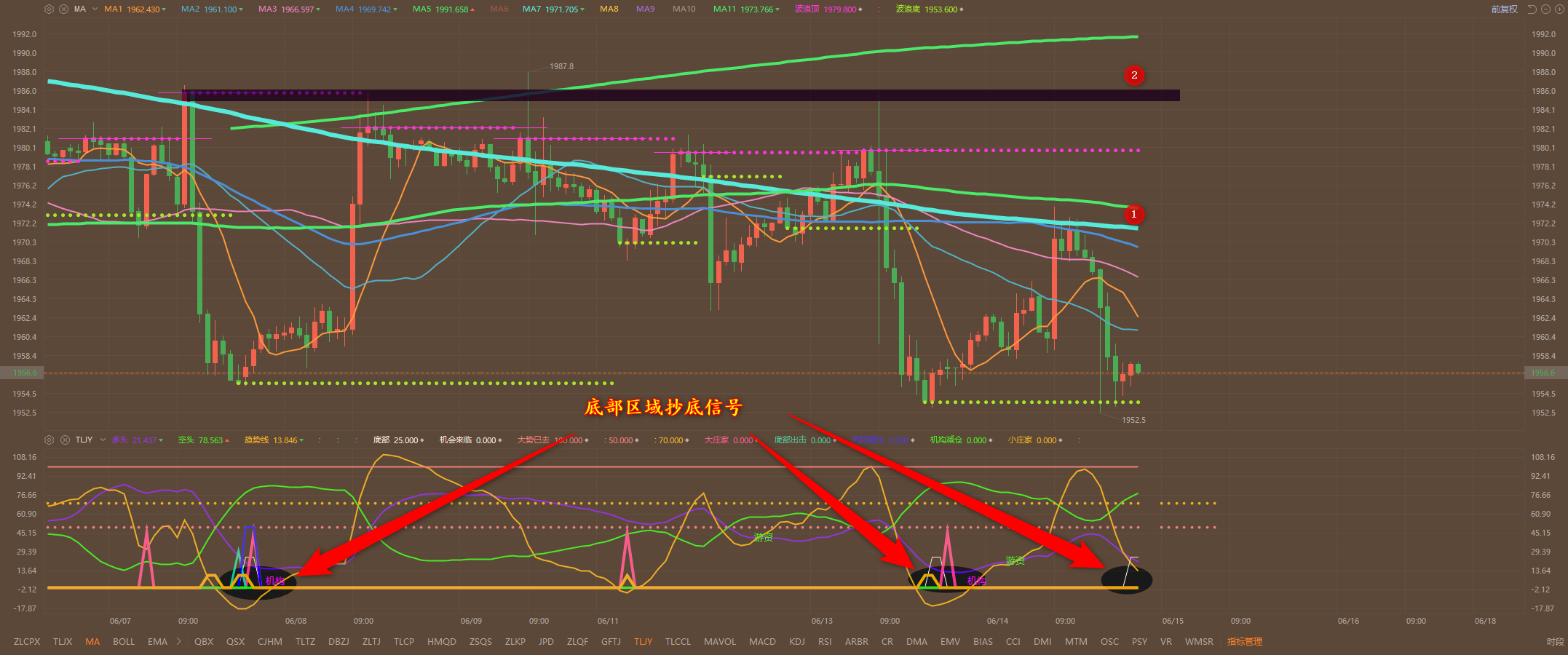 通过对黄金小时图解析得知,昨日行情如期在上方1号均线压力位受阻回落再次到达下方1940一线我们从下方的幅图再次看到出现底部信号在前期底部的位置都出现一波反弹,虽然还没有突破震荡区间小妹个人认为在这里筑底的可能性比较大一点,但是不排除数据影响进一步回调到下方1931一线,短期上方我们还需要关注12号的压制即可,在操作上我们继续高空低多思路,具体建议如下: