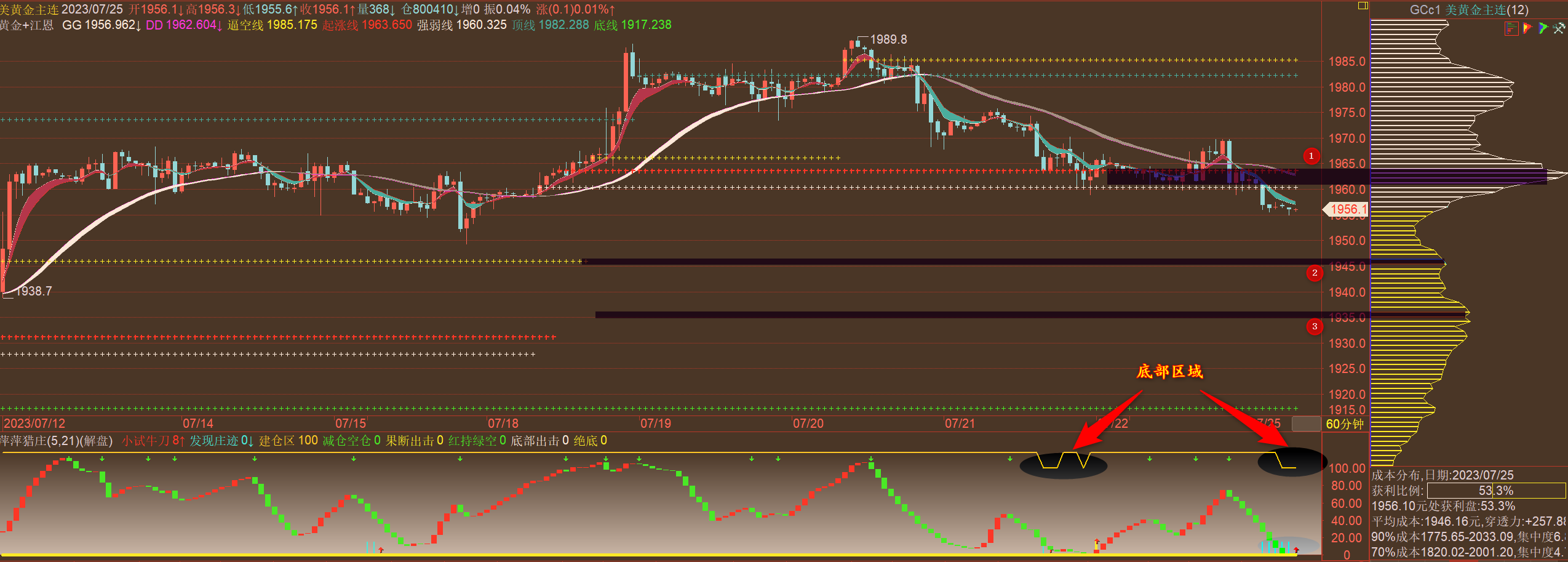 通过对黄金小时图解析得知,昨日行情先涨后跌,在1号的支撑位小幅反弹一波到达上方1968一线冲高回落下半夜跌破下方1956 的支撑,目前呈现弱势盘整状态,上方1号支撑位短期已经成为关键压力位,除非今日盘中放量突破并且站上,否则将会继续下探到23号的支撑位,我们从下方的幅图也可以清楚地看到短期已经连续出现底部信号多头主力在下方有建仓动作,但是不排除下探到23号的支撑位目前下方还没有出现诱空动作也没有超级主力抄底信号,盘中我们敬请关注小妹的通知,在操作上我们继续高空低多思路,具体建议如下: