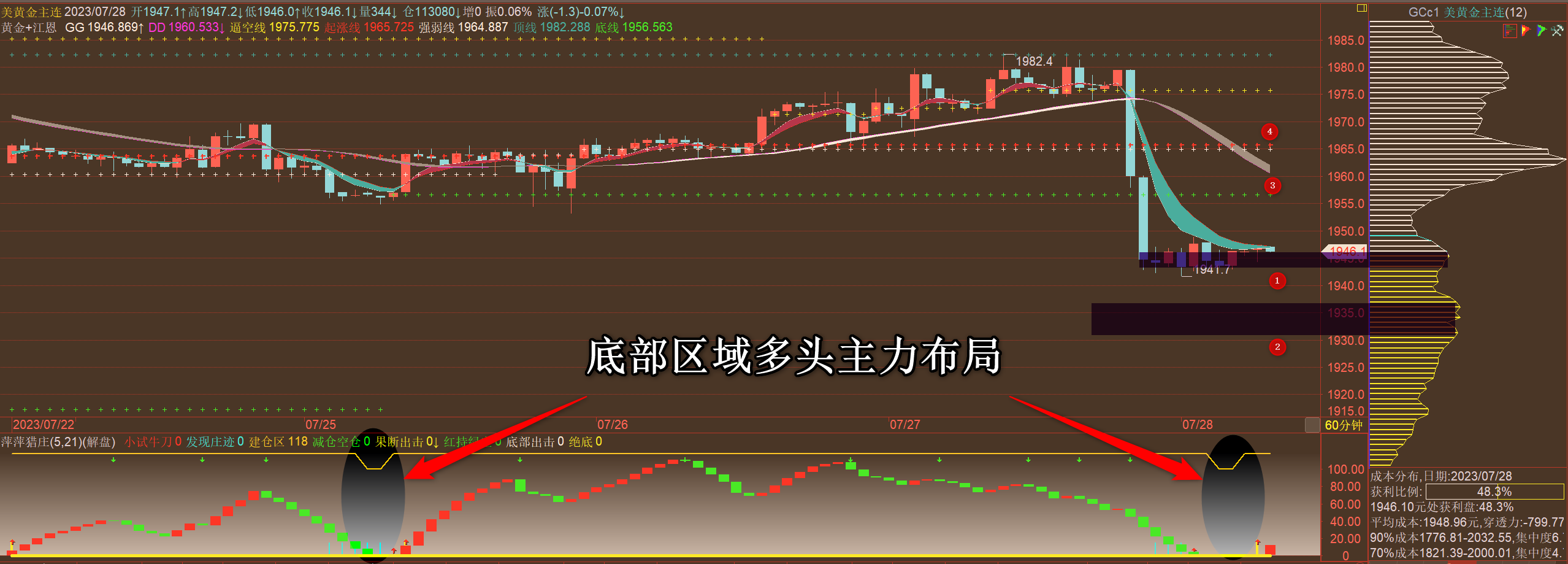 通过对黄金小时图解析得知,昨日行情接二连三的放量跌破3,4号的支撑,目前反过来已经成为压力,虽然目前在下方1号支撑位有所减缓并且在下方出现了阶段性底部信号小妹预期非常有可能将会进一步的下探下方2号强支撑,昨日早盘就已经说过多空主力同时处于出逃状态,盘中的表现要进行宽幅震荡运行动作,我们重点关注下方的支撑位即可,以及上方的压力位即可,在操作上我们继续高空低多思路,短期目前止损一部分主力抄底介入还没有出现超级主力抄底信号,家人们敬请关注盘中通知,短期暂且按照以下建议参与即可: