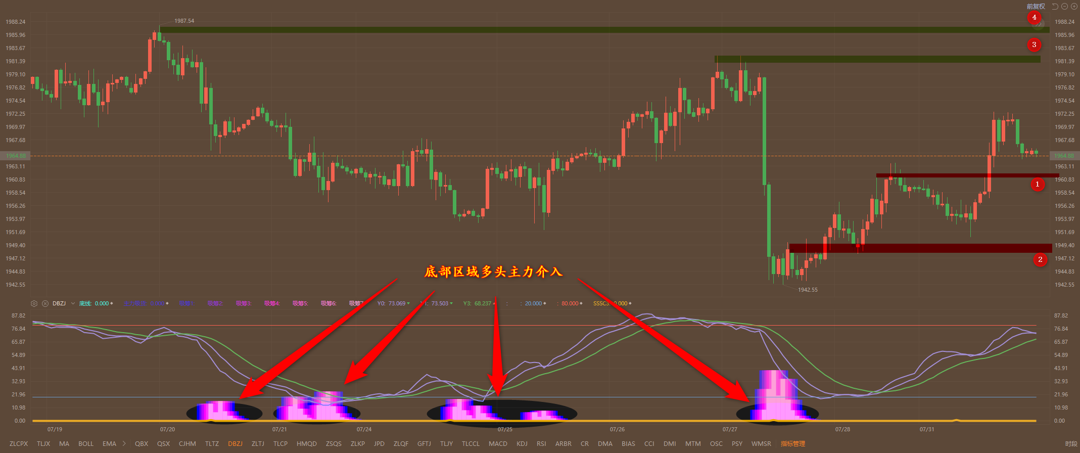 通过对黄金小时图解析得知,昨日行情先跌后涨接近下方2号支撑位止跌反弹晚间到达上方1972一线冲高回落我们从下方的幅图中可以清楚地发现前期在回落的过程中在阶段性底部区域都出现了多头主力布局建仓的动作星期五晚间也是都出现了不错的反弹空间上周五受数据影响冲高回落,我们上周五就已经说过短期将会继续宽幅震荡运行,目前依然是处于反弹过程中上方我们继续重点关注34号的压力,下方我们重点关注12号的支撑,短期继续维持在1940-1990这个区间宽幅震荡运行,在操作上我们继续高空低多思路,具体建议如下: