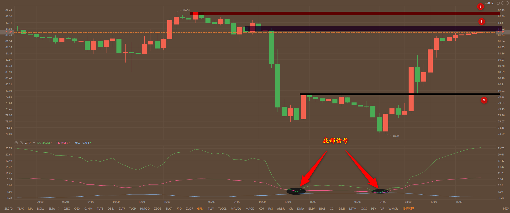 通过对原油小时图解析得知,昨日行情先跌后涨,最低下探到78.50一线止跌反弹晚间一度拉升到上方1号压力位,下的雨也是有一定的压制作用但是不排除进一步突破到达2号压力位,行情之所以会出现反弹动作,我们从下方的幅图可以清楚地看到到达下方79.00和78.70一线出现了三军会师动作阶段性底部信号盘中一度放量突破3号压力位,目前反过来已经成为支撑,短期在操作上我们继续高空低多思路,具体建议如下:
