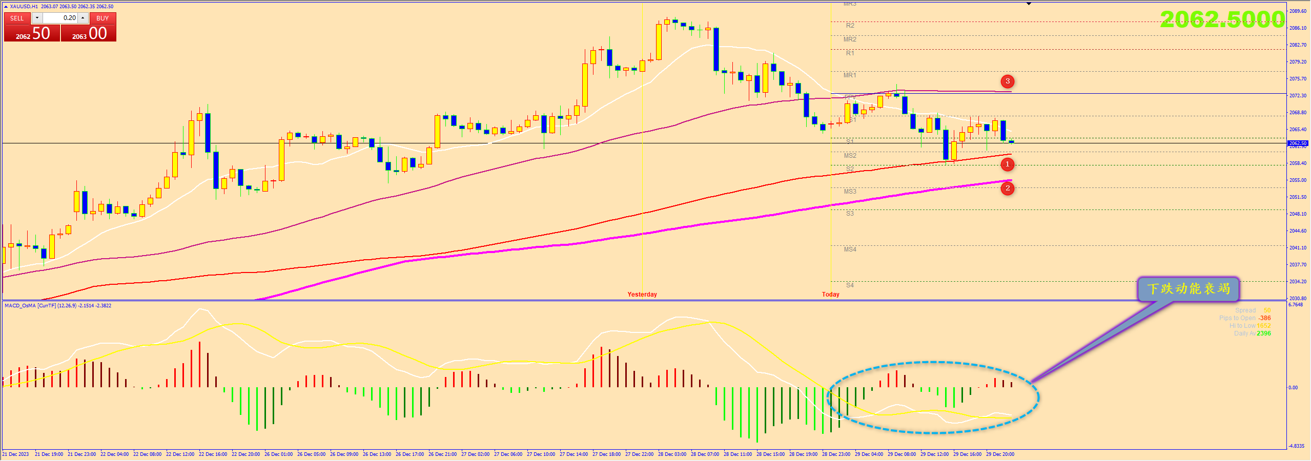 通过对黄金小时图解析得知,上一个交易日黄金先涨后跌继续延续下跌走势,从主图中我们可以清楚的看到上方3号均线压力位受阻回落,晚间在下方1号均线位止跌反弹,我们从下方的附图可以清楚的看到虽然目前依然是在零轴下方运行但是下跌的动能有所减缓说明在下方的均线支撑位附近出现了抵抗性资金进仓,短期表现下跌动能衰竭,但是不排除进一步下探到下方2号均线的支撑位,短期在操作上我们继续高空低多思路具体建议如下: