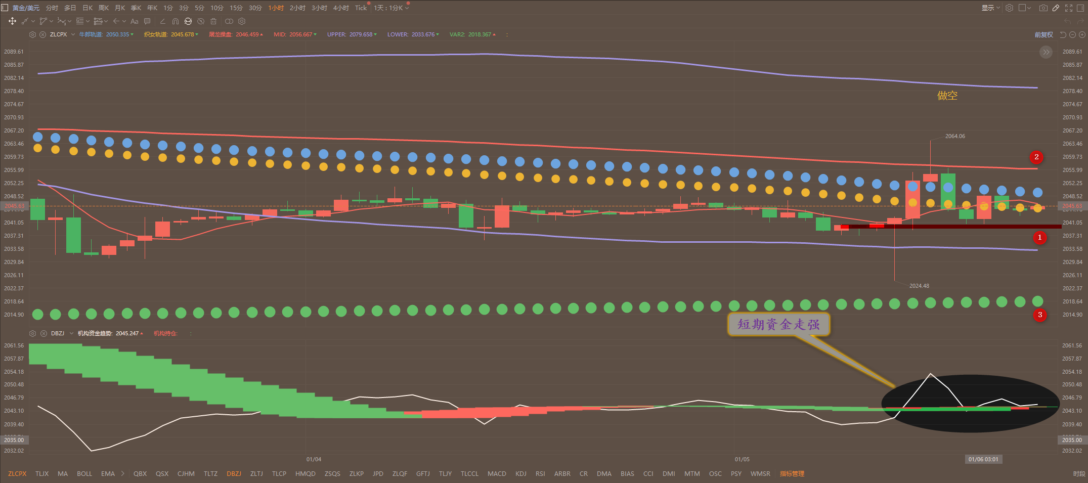 通过对黄金小时图解析得知,上一个交易日行情如期先跌后涨,在上方2064一线受阻回落收盘于2045一线,我们从下方的附图可以清楚的看到目前短期资金已经开始走强,多头主力也开始进仓,但是短期上方受制于双轨和布林带中轨的压力,短期下方我们重点关注13号的支撑,盘中不排除受数据影响进一步下探到3号强支撑位,预计短期继续窄幅震荡运行微进一步拉升突破做好准备,短期在操作上我们先高空低多思路,具体建议如下: