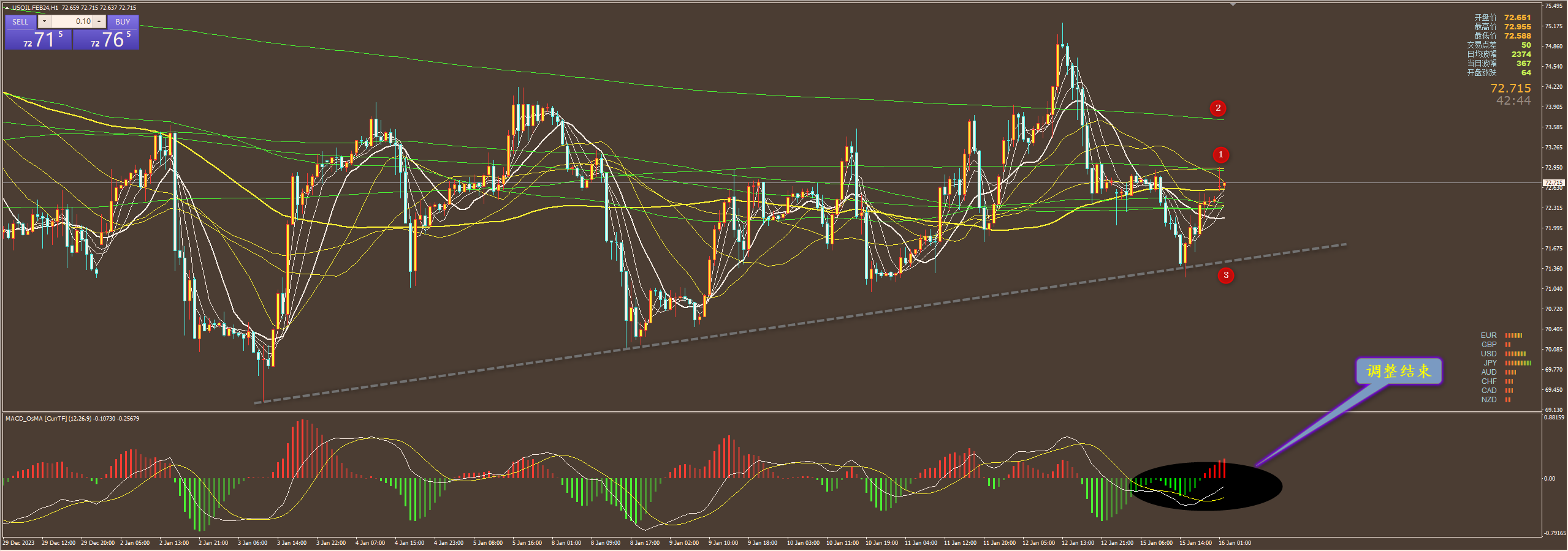 通过对原油小时图解析得知,昨日行情先跌后涨,如期到达下方上升趋势线的支撑位(3号位),我们从下方的附图MACD可以清楚的看到短期调整已经结束,在下跌的过程中下跌的动能明显减弱,虽然还在零轴下方运行但是进一步向上运行的可能性比较大一点,预计短期继续先震荡盘整短期下方我们继续关注3号趋势线的支撑,上方我们重点关注12号均线的压力,在操作上我们继续高空低多思路,具体建议如下: