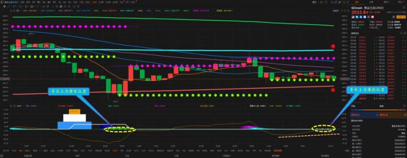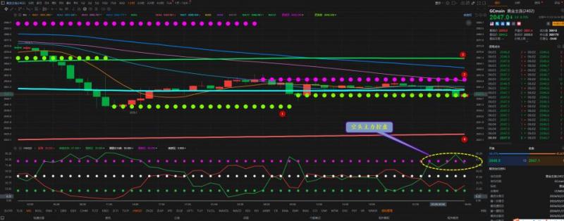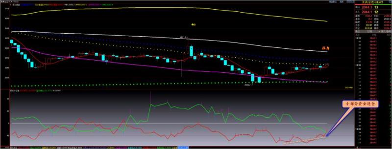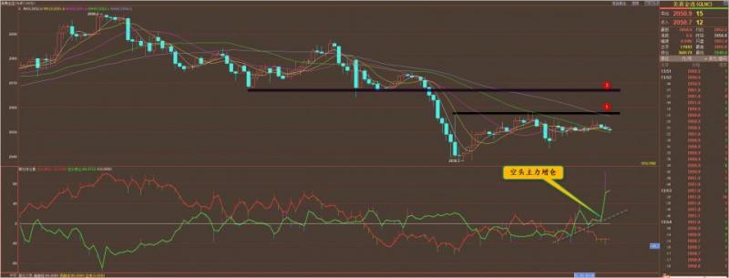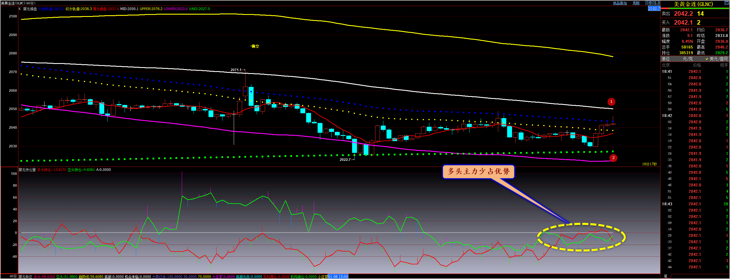 通过对黄金小时图解析得知,昨日行情如期冲高回落再上方2042一线受阻,我们从下方的附图可以清楚的看到正如小妹晚间所说属于被动式反弹构不成反转还需要时间和空间进行震荡筑底,从下图中可以清楚的看到多头主力的力道不足空头主力虽然也在出逃状态但是空头主力依然是处于控盘的状态,短期将会继续窄幅震荡运行,在操作