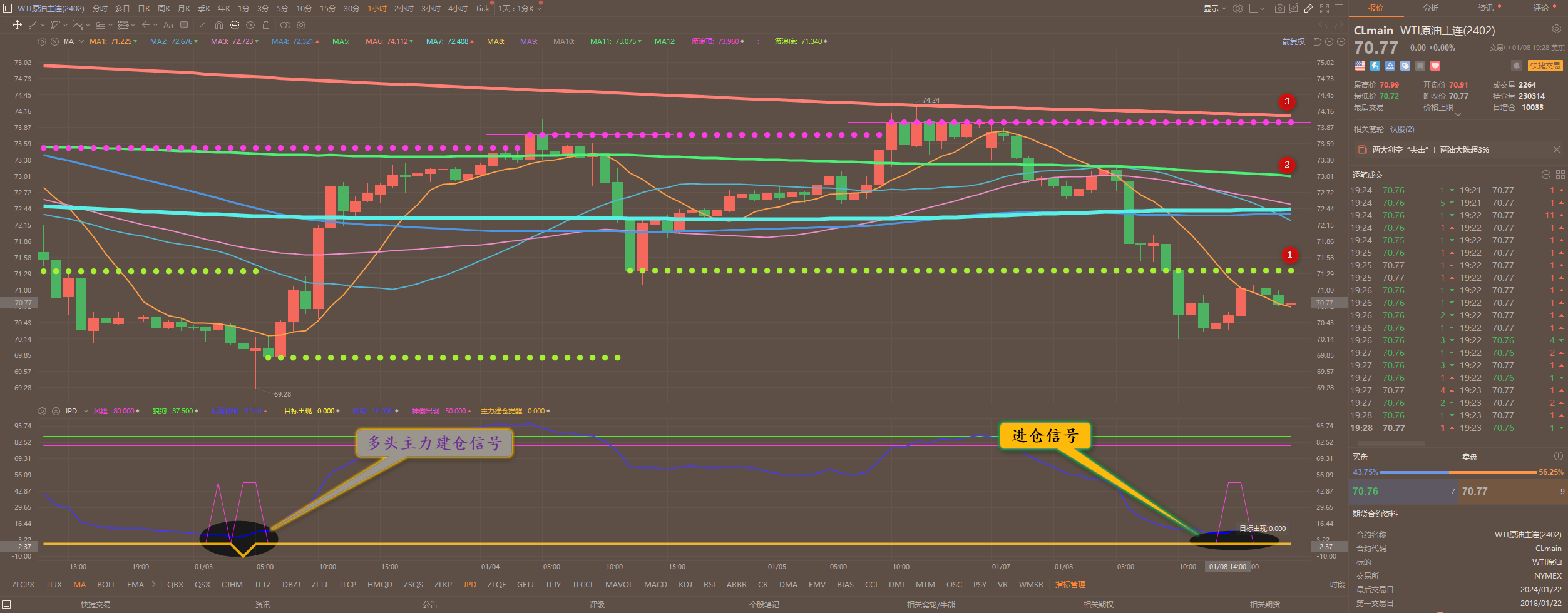 通过对原油小时图解析得知,昨日行情继续延续下跌走势晚间一度到达下方70.10一线,目前小幅反弹中,从整体走势来看已经再次回到前期的多头主力建仓的区域相对而言也是有一定的支撑作用的,我们从下方的附图也可以清楚的看到在底部区域再次出现进仓信号,短期上方我们重点关注123号的压力位,下方继续重点关注70.20和69.2
