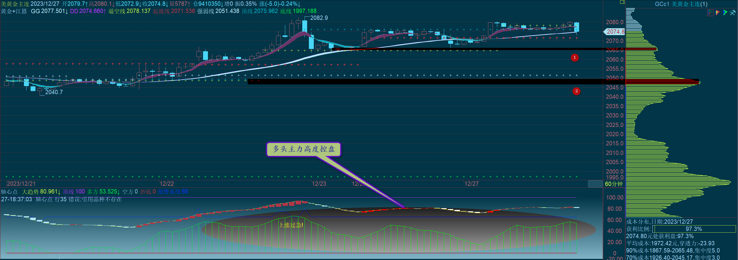 通过对黄金小时图解析得知,黄金从早盘继续冲高回落在上方2069一线受阻回落,短期我们继续昨日低位的支撑同时也是筹码峰值的第一强支撑,我们从下方的附图可以清楚的看到近期几个交易日多头主力一直都是处于高度控盘的状态行情有继续向上突破的迹象,但是也不排除受数据影响进一步下探到下方2号强支撑位2038一线,短期大