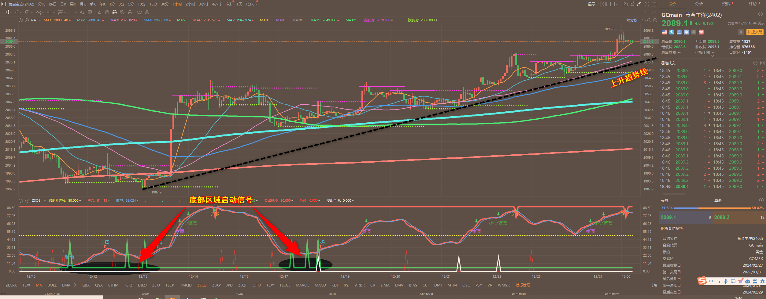 通过对黄金小时图解析得知,昨日行情如期实现突破在盘中回落2061一线止跌反弹上涨,我们从下方的附图可以清楚的看到在前期底部区域多次出现启动上涨信号,目前已经完全脱离底部区域如期沿着上升趋势线震荡上行突破,短期上方我们重点关注一下2100和2120一线的压制。下方2070一线已经反过来成为短期的强支撑以及下方上升