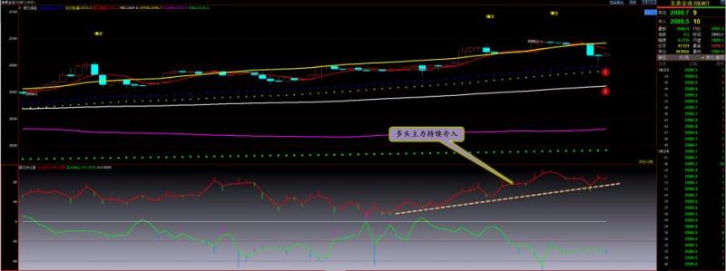 通过对黄金小时图解析得知,昨日行情先涨后跌在上方2088一线受阻回落晚间到达2064一线,没钱再次回到星期三的启动上涨的位置,我们从下方的附图可以清楚的看到短期目前已经进入零轴下方运行有走弱迹象,不过短期依然下方120日和年线的支撑做依托整体大方向上涨不变,短期我们重点关注下方1号均线的支撑,以及上方2号均线