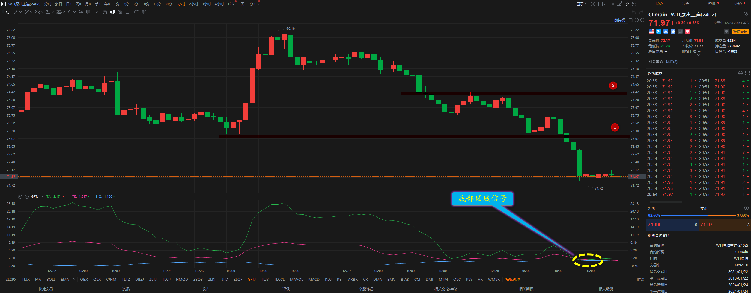 通过对原油小时图解析得知,昨日行情先涨后跌晚间在下方1号均线支撑位止跌反弹,我们从下方的附图可以清楚的看到,目前已经再次出现底部区域建仓信号,在前期68.00一线出现了底部区域建仓信号行情大幅反弹了800多点的空间,今日再次出现预计也是要大幅反弹一波,短期我们暂且关注下方12号的支撑以及上方3号均线的压力,