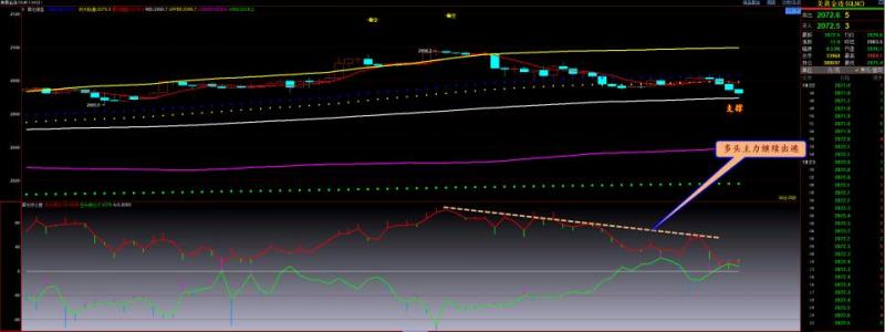 通过对黄金小时图解析得知,黄金从早盘冲高回落以来再次跌破昨日的低点,之所以反弹无力我们从下方的附图可以清楚的看到从昨日开始多头主力一直是处于出逃的状态,目前即将到达下方布林带中轨的支撑(2058一线),就看多头主力会不会掉头向上增仓介入,否则就会到达下方2045一线的支撑,短期调整还没有结束,在操作上我