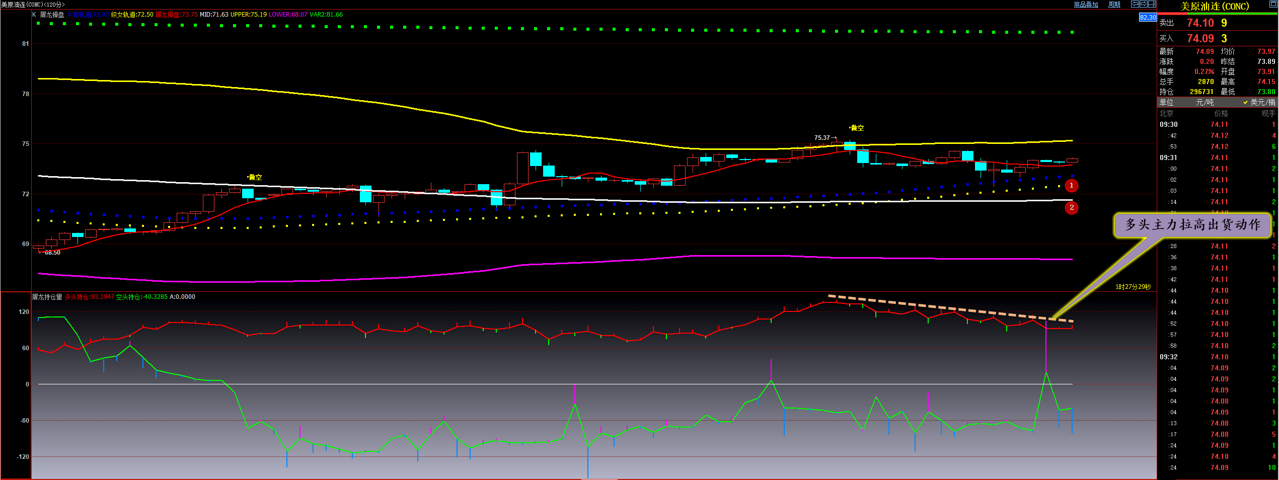 通过对原油2小时图解析得知,昨日行情先涨后跌再上涨,晚间在下方双轨的支撑位止跌反弹,我们从下方的附图可以清楚的看到多头主力连续2个交易日处于流出的状态,说明有多头主力在高位拉高出货,整体行情依然偏强走势,短期行情继续沿着布林带以及双轨继续震荡上行,重点关注12号的支撑即可,在操作上我们继续重点逢低做