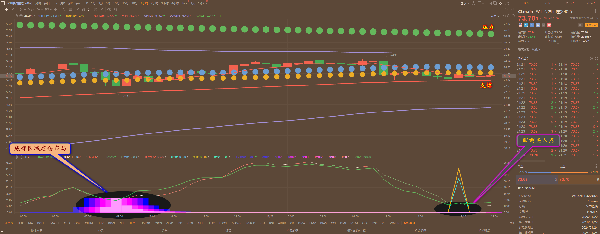 通过对黄金小时图解析得知,黄金从早盘到目前为止小幅上扬,自从上周回调到下方布林带中轨的支撑位得到多头主力在底部区域不断地增仓介入从而导致行情的突破上行,我们从下方的附图可以清楚的看到上周五在回落的过程中多头主力有小幅介入迹象,白天时间段盘中小幅拉升,目前多头主力整体处于高度控盘的状态,理论上应该