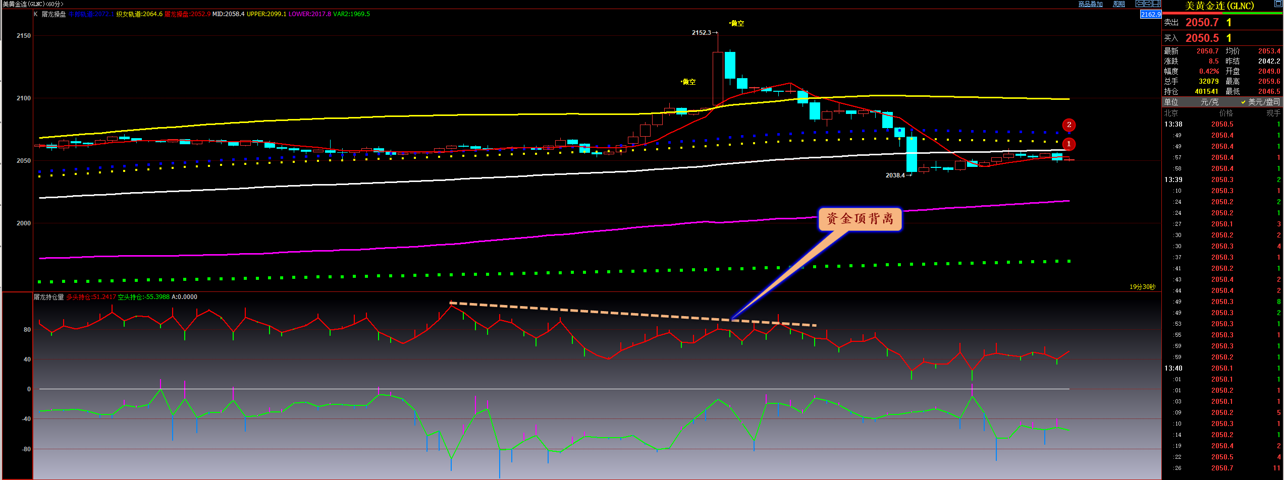 通过对黄金小时图解析得知,黄金从早盘到目前为止依然是窄幅震荡调整运行,但是依然是在布林带中轨之下运行,我们从下方的附图可以清楚的看到自从哈气从高位一落千丈回抽的空间比较多,但是我们从下方的附图可以清楚的看到多头主力的持仓量依然是大于空头主力的持仓量并且这两天有小部分资金建仓迹象,但是上方依然受制